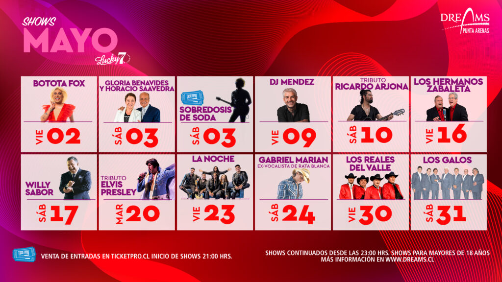 Uncategorized Cartelera Dreams mes de mayo abril 28, 2025 Atención Magallanes!!Te dejamos la cartelera del mes de Mayo 2025 de los artístas que se estarán presentando en Dreams Punta Arenas, no te lo puedes perder!! Facebook Twitter Telegram WhatsApp Artículos Relacionados Las recientes declaraciones desde Argentina deben invitarnos a una reflexión seria 16 de abril de 2026 La Soberanía Chilena en Magallanes no está en discusión 16 de abril de 2026 NATALES SE PREPARA: ¡UNIDOS POR NUESTRA SEGURIDAD! 14 de abril de 2026 Intenciones del Gobierno del Presidente Kast 14 de abril de 2026 Deja una respuesta Cancelar la respuestaTu dirección de correo electrónico no será publicada. Los campos obligatorios están marcados con *Comentario * Nombre * Correo electrónico * Web Guarda mi nombre, correo electrónico y web en este navegador para la próxima vez que comente.