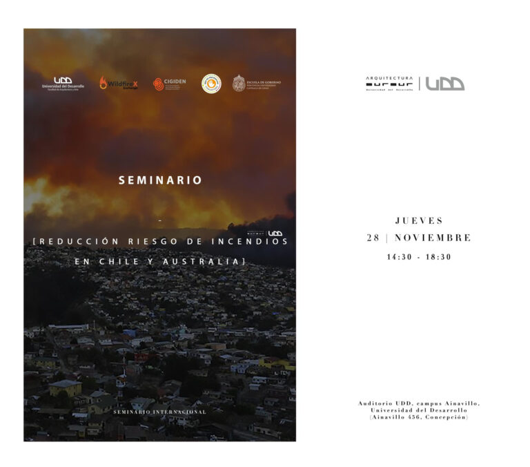 Te invitamos a participar en el seminario “Reducción del riesgo de incendios forestales: Chile y Australia”, organizado por la Facultad de Arquitectura y Arte de la Universidad del Desarrollo, sede Concepción, en colaboración con el Centro de