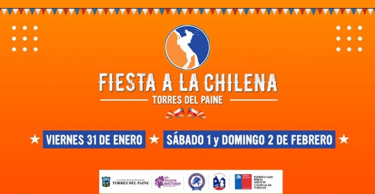 La Ilustre Municipalidad de Torres del Paine, te invita a disfrutar de las actividades de La Fiesta a La Chilena realizarse este viernes 31 de Enero y sábado 1 y domingo 2 de Enero en la localidad