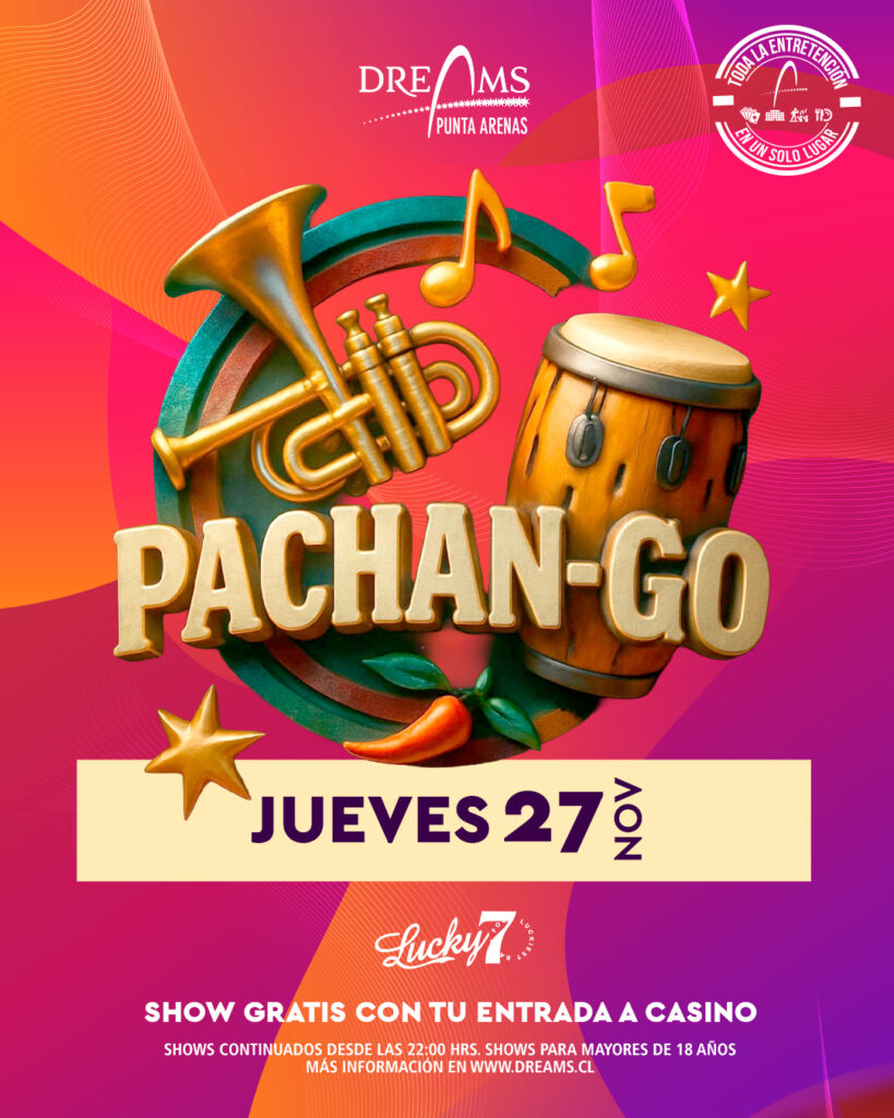 Uncategorized ¡Este jueves 27 de noviembre la pachanga se vive a full en Lucky 7 con PACHAN-GO! noviembre 24, 2025 Prepara tus mejores pasos porque el ritmo no para. ¡Un show lleno de energía, música y diversión! Y lo mejor, el show es gratis con tu entrada al casino. Facebook Twitter Telegram WhatsApp Artículos Relacionados ¡Primeros shows de diciembre! 3 de diciembre de 2025 Noche imperdible en Dreams Punta Arenas 3 de diciembre de 2025 En la ley de presupuesto vote en contra 30 de noviembre de 2025 Hoy le dieron la espalda a la Patagonia y al territorio Antártico 30 de noviembre de 2025 Deja una respuesta Cancelar la respuestaTu dirección de correo electrónico no será publicada. Los campos obligatorios están marcados con *Comentario * Nombre * Correo electrónico * Web Guarda mi nombre, correo electrónico y web en este navegador para la próxima vez que comente.